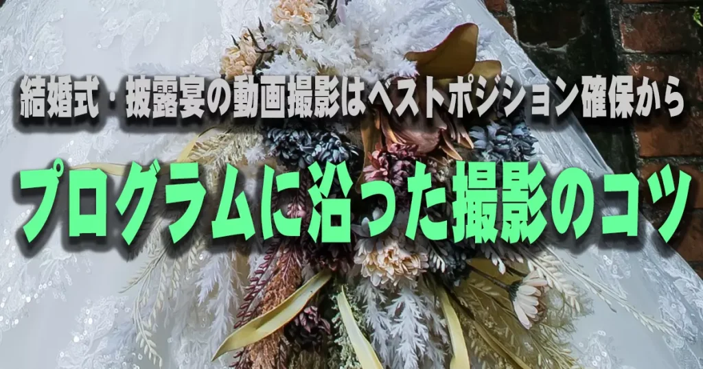さあ、いよいよ結婚式の当日になりました。まずはここまで来たらリラックスして動画撮影に臨みましょう。 このページでは、一般的な結婚式や披露宴の式次第を紹介しながら、各場面にベストポジションや、 その場面にふさわしい動画撮影のコツやテクニックをサンプル映像やイラストでご紹介します。